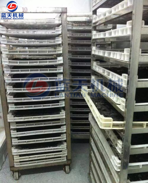 第四步:海參烘干:將煮好的海參擺放在物料盤上,將擺好海參的物料盤放置入空氣能熱泵海參烘干機內,通過智能控制系統設置烘干溫度、濕度和時間參數,開始干燥。