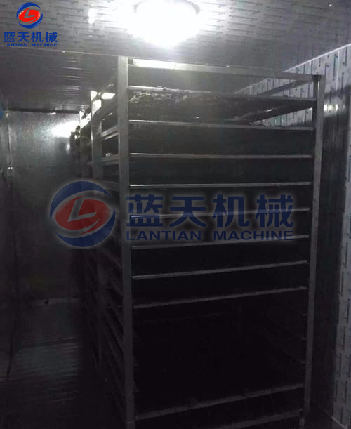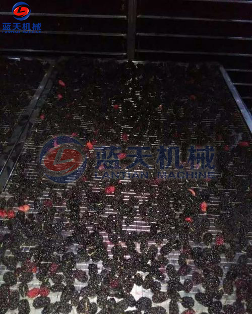 桑葚裝盤:使用桑葚烘干機干燥處理,時間要18個小時就可以干燥處理完了。一般每4公斤鮮桑葚可制成1公斤桑葚干。將經整理去雜后的桑葚裝篩子,裝入物料車內。每臺物料車不宜超過14個篩子,篩子層間距控制在10公分左右。以10P機為例,不要超過10臺物料車,以保證烘干房內有合理間隙位,利于熱風通過。