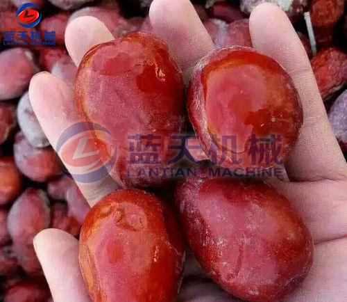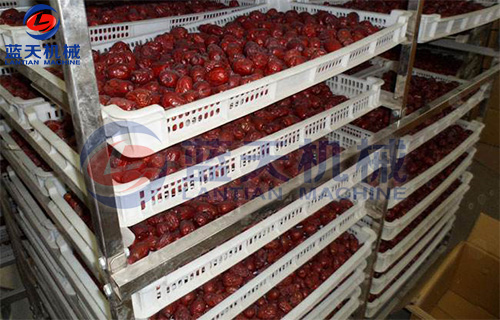 3、烘干工藝:先在熱水中瀝干棗表面的糖漿,然后裝入物料盤,將物料盤物料車,推入烘干房,使含水量降至15%左右,烘干溫度開始為50℃,過(guò)6-7小時(shí)升至70-80℃等棗皮發(fā)皺即可,用手摸感到外硬內(nèi)軟時(shí)取出包裝。