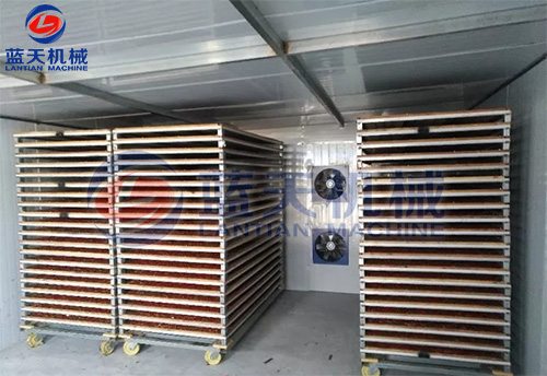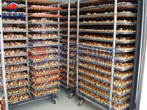 脫青皮后8小時內入倉上架排濕烘烤,排濕溫度35-40℃,烘烤時間12-15小時,果殼表面水分散失,顏色由黑褐轉為褐色時排濕結束。