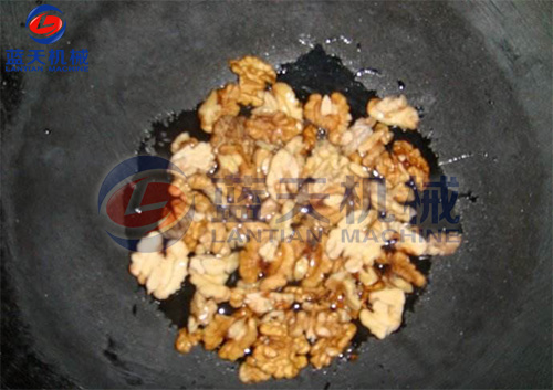 在夾層鍋中加入20――30升水,再加入60千克甜菜糖、30千克葡萄糖和10千克果葡糖漿,邊攪拌邊加熱至沸,視全部溶解后,加入檸檬酸100――200克。把烤好的核桃仁趁熱倒入糖液中,攪拌均勻。出鍋后繼續在60――80℃溫度下烤干。