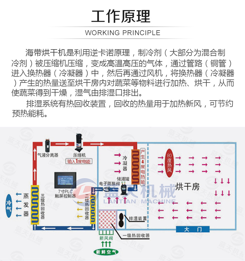 要達(dá)到以上的要求,那么烘干設(shè)備是很嚴(yán)格的。傳統(tǒng)的太陽晾曬等方法都是不合格的,海帶烘干機需要消耗少量的電就能從空氣能吸取大量的熱能使烘干房迅速升溫,同比傳統(tǒng)的烘干設(shè)備節(jié)能百分之六十以上。海帶烘干設(shè)備在常壓常溫下運行,烘干過程幾乎沒有污染物排放,不會對產(chǎn)品和環(huán)境造成污染。海帶烘干房是真正可靠的新型烘干設(shè)備。海帶烘干機烘干成本低,效率也高,提高了商家的利益,我們都知道海帶的價格是很便宜的,所以如果想要從中獲得利益,那么成本不能高,成本一高,也就掙不到什么。所以海帶烘干機是適合用來烘干海帶的。