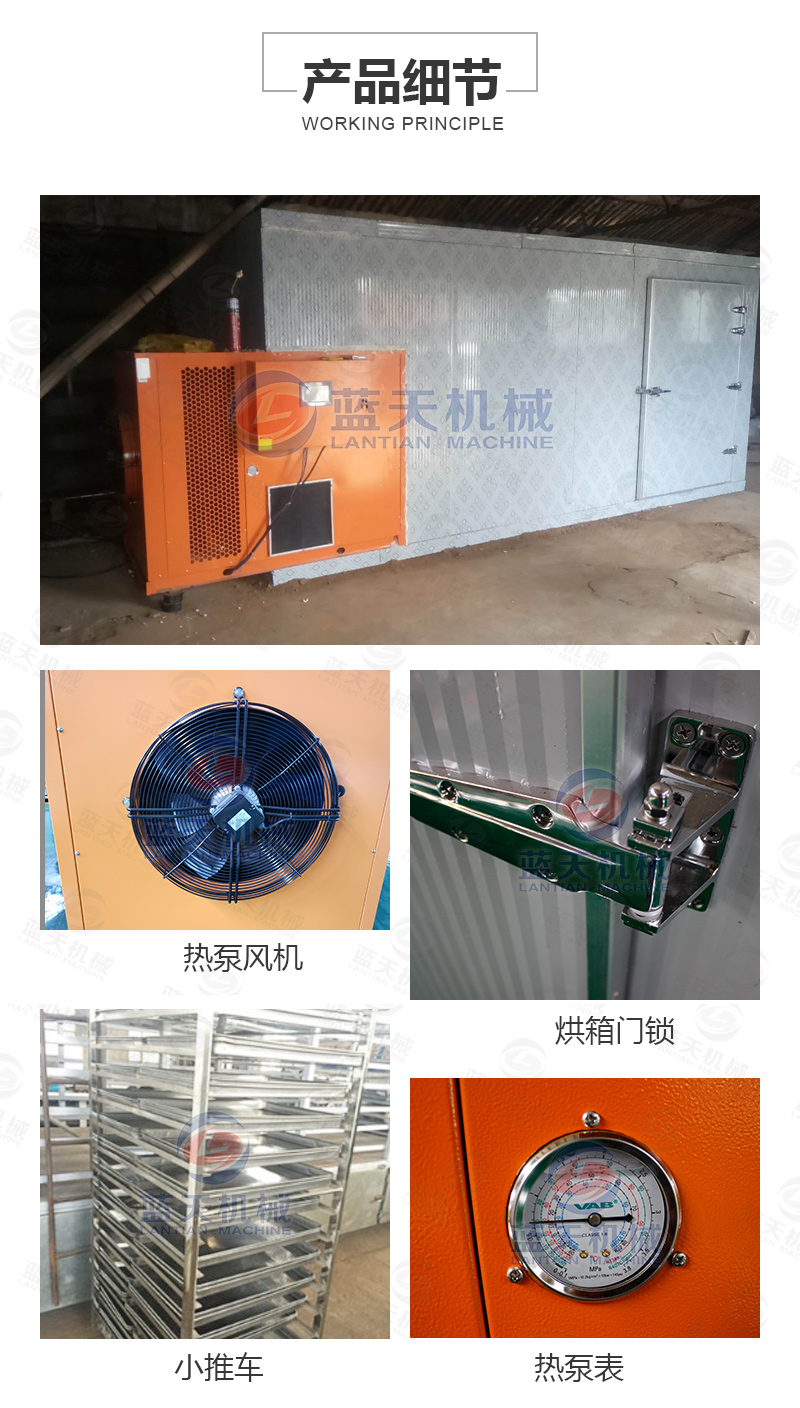 2.葡萄干烘干機(jī)熱泵烘干:托盤裝載量14~20kg/m~2,初溫45~50℃,終溫70~75℃;烘干時(shí)間42~60h。系統(tǒng)除濕量要大,脫水率已達(dá)70%。葡萄全干后仍保持綠色。烘干干燥適度的葡萄干,肉質(zhì)柔軟,用手緊壓無汁液滲出。含水量為 15%~17%,干燥率為3:1~4:1。