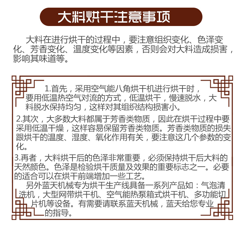 有的客戶八角產量數萬噸,如果選用大型八角烘干機,在幾天-1個月的時間內就可以完成全部八角的烘干,且大型八角烘干機的烘干效果很棒,色澤、破損率、香味都保持的不錯。講到這里,大家應該就會知道八角烘干機有不同型號的,那對八角烘干機多少錢來說,就是看機型而異了,如果您對八角烘干機感興趣有需要,歡迎您聯系我們進行咨詢。