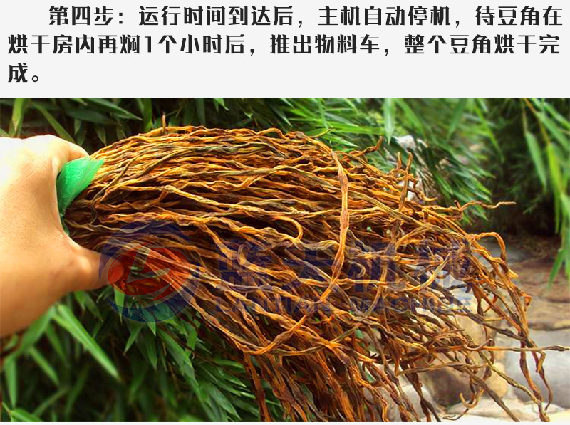 四:運行時間到達后,主機自動停機,待豆角在豆角烘干機內(nèi)再燜1個小時后,推出物料車,整個豆角烘干完成。