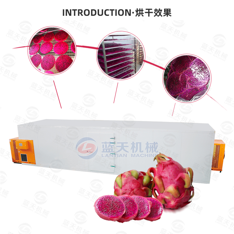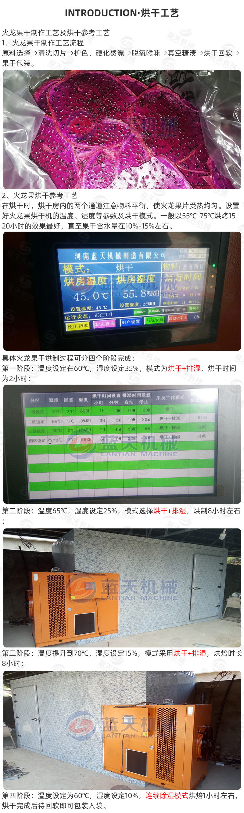 火龍果烘干機工藝參數的設定。設置好火龍果烘干機的溫度和濕度參數。烤烤溫度越高,果脯的色澤與口咸越差。其中以55-75攝氏度的溫度烘烤16-20小時的效果很好。在烘烤時,火龍果花烘干設備內的兩個通道注意物料平衡,使火龍果片受熱均勻。