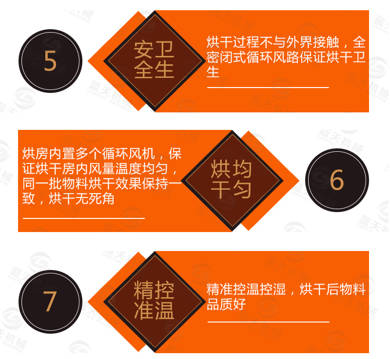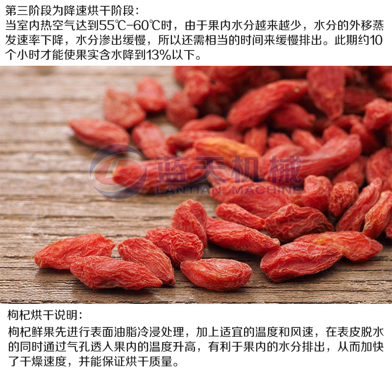 高濕低溫段,溫度小于50度,范圍40度~50度,避免高溫高濕造成枸杞顏色的變化,觀(guān)察枸杞表面水汽變化,隨時(shí)排潮,這段時(shí)間應(yīng)在3~3.5小時(shí)。