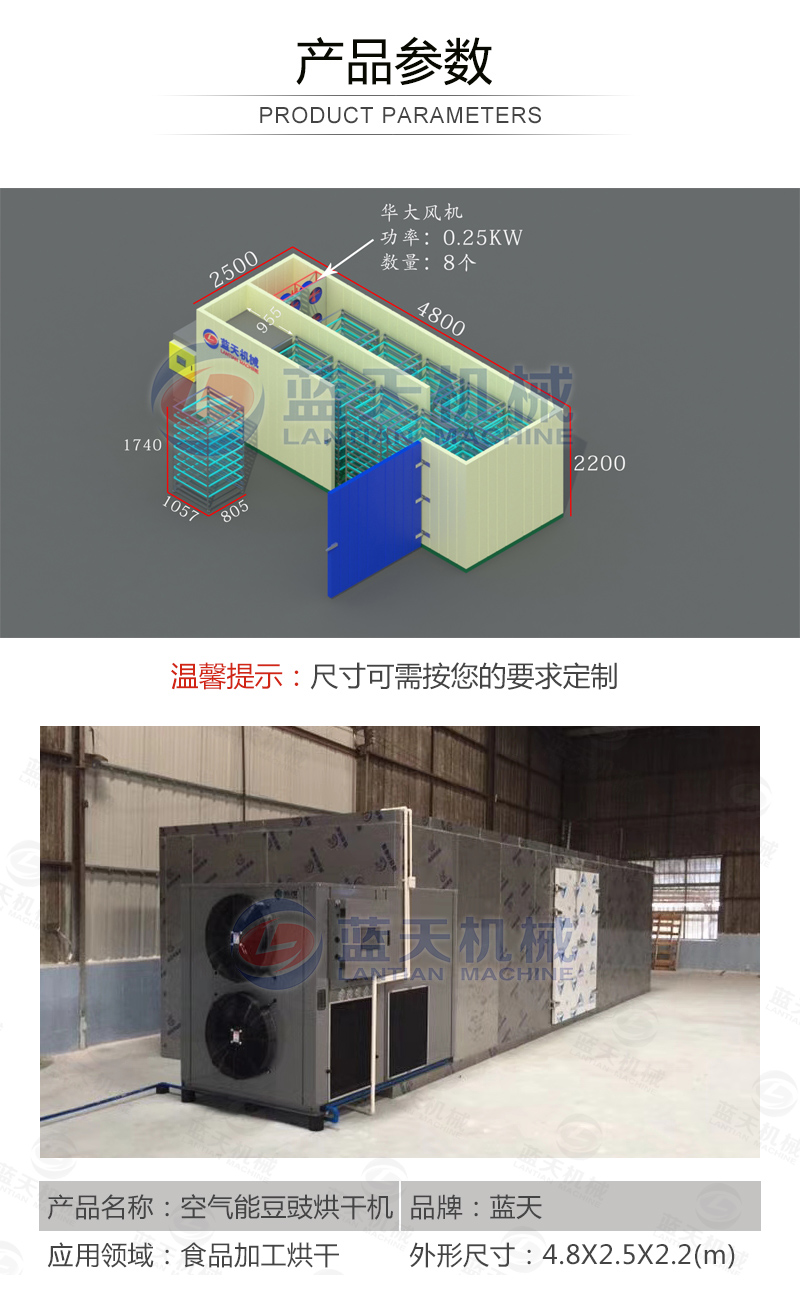 豆豉富含蛋白質、各種氨基酸、乳酸、磷、鎂、鈣及多種維生素,色香味美,我國南北部都有加工食用。但若不注意加工藝,會致使品質下降,甚至霉變,造成經(jīng)濟損失。傳統(tǒng)上使用太陽光曬制,但是生產(chǎn)效率低下,并且在曬制過程中極容易有污染,本文介紹使用一種基于空氣能熱泵技術的豆豉烘干設備,大大加快了豆豉的生產(chǎn)流程。