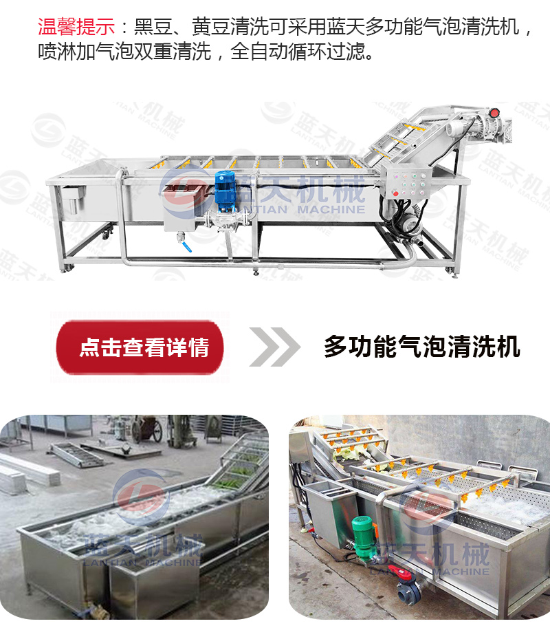 1、原料選擇及清洗:選擇成熟、顆粒飽滿均勻、皮薄肉多、無蟲蝕、無霉爛變質、并且有新鮮度的黃豆或黑大豆為宜。用清水多次洗去大豆中混有的砂粒雜質等。有條件的可以使用自動化的果蔬清洗機來大批量清洗黑豆。